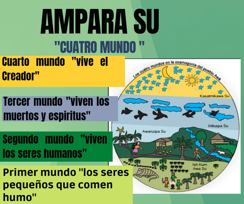 Los +nkal Awá antiguos siempre han narrado, la existencia de cuatro mundos, el primero estan los Ish kum Awá seres más pequeños que comen humo. El segundo es la tierra donde habitamos todos los seres vivos, el tercero es el espacio entre la tierra y el cielo donde estan los seres que mueren y el cuarto está el creador el que sustenta a los tres mundos.